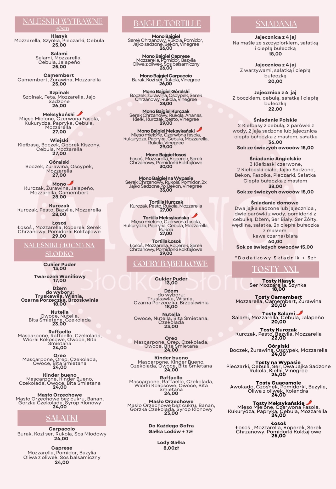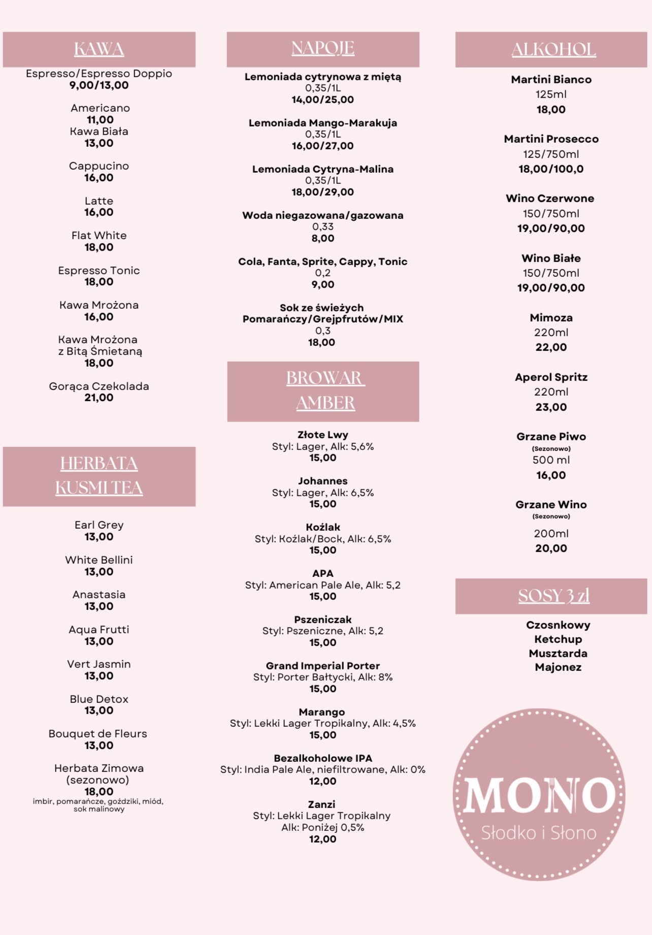 Zespół Mono Słodko i Słono , serdecznie wita Was w Markach! Zostaniecie przywitani prawdziwą gościnnością i wspaniałą ofertą naszej kuchni. Zabierz ze sobą przyjaciół i rodzinę i rozpłyńcie się w naszych smakach. Jeśli macie ochotę na coś słodkiego, nasze wyśmienite desery zachwycą Twoje podniebienie. Zapraszamy również na śniadanie, lunch i podwieczorek w naszym stylowym lokalu, Oraz miły ogródek piwny i muzykę.